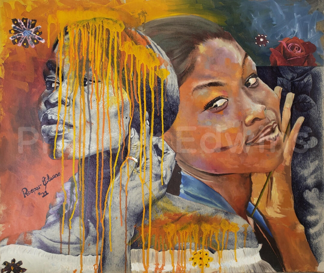 'Whatchamacallit' is a powerful visual tour that explores the emotional depths and demonstrates the healing power of art.this stunning fusion of ballpoint pens and oil paints tells a story of silent admiration and anguish about the dance of love that is not reciprocated.the background features an intricate arrangement of symbols, including hearts and broken hearts, highlighting the complexity of love and pain.a symbolic flower emerges behind the primary figure, separated into two halves: one painted and the other precisely produced with a pen.the heartbreaking duality represents the delicate balance between life and death, reflecting the fluctuation of emotions.the most striking feature is the opposing paint that drips over the other twin, creating a barrier between them. the dripping paint represents the insurmountable barrier and unrequited affections.'Whatchamacallit' probes into the artist's soul and urges viewers to reflect on the complicated web of emotions in each stroke.art can serve as a therapeutic tool, allowing for emotional release and reflecting the human experience of love and grief.