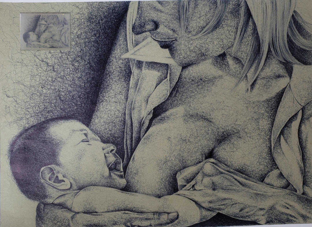 in this touching ballpoint pen drawing titled 'Motherhood,' the strong link between a mother and her infant is captured with astonishing clarity.the gentle image of a mother holding her kid in her arms encapsulates the universal essence of motherly love, depicting a moment of pure connection and protection.the expressive scribbles in the artwork highlight the smooth curves and expressions that create a profound sense of love and compassion.the artwork is an emotional ode to the enduring and unparalleled affection that defines the world—a mother's love.the drawing elicits an emotional response due to the medium's simplicity, reminding viewers of the eternal and indestructible tie that serves as the foundation of family and life.the work of art captures the strength, grace, and unshakable commitment that motherhood embodies, celebrating the beauty of this precious bond.
